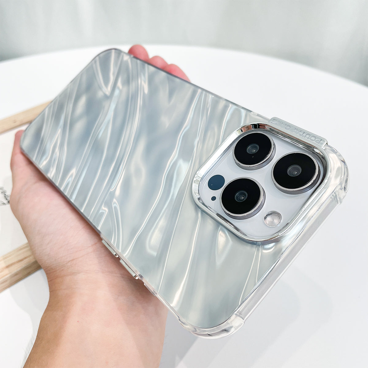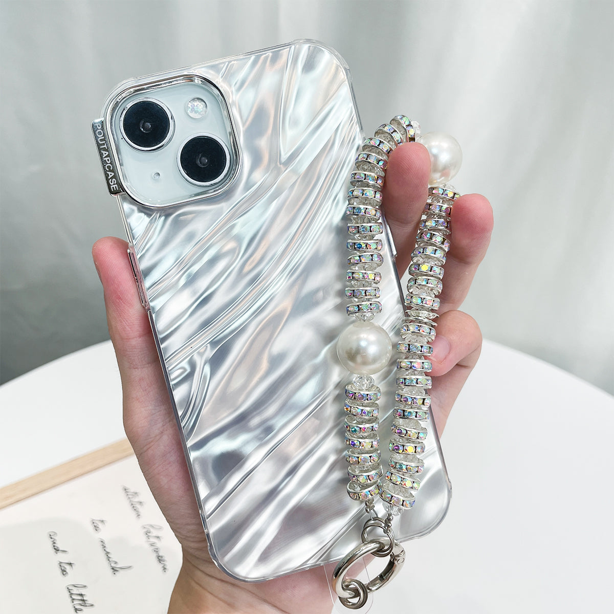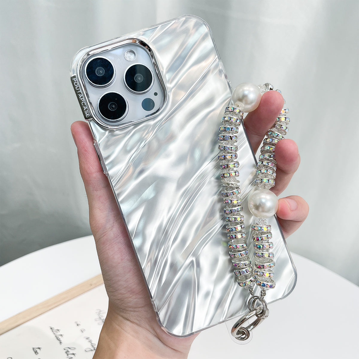 Luxus Schimmerndes Perlmutt Weiß Case mit Handband für iPhone 15